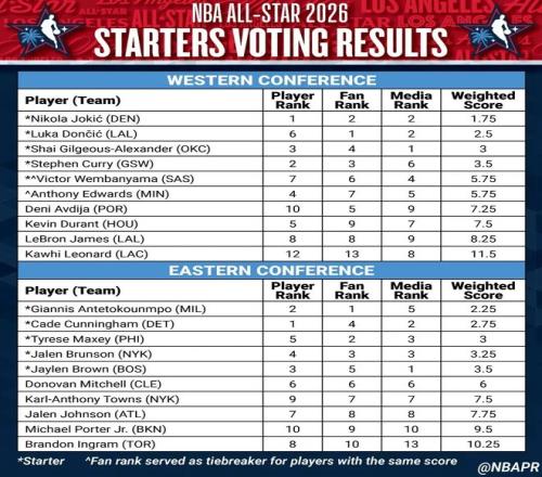 对于这套首发名单,东部名单基本属于板上钉钉,东部五人几乎横扫了投票前五名。对比来看,西部名单就竞争激烈不少,背后的内容细节也更多。